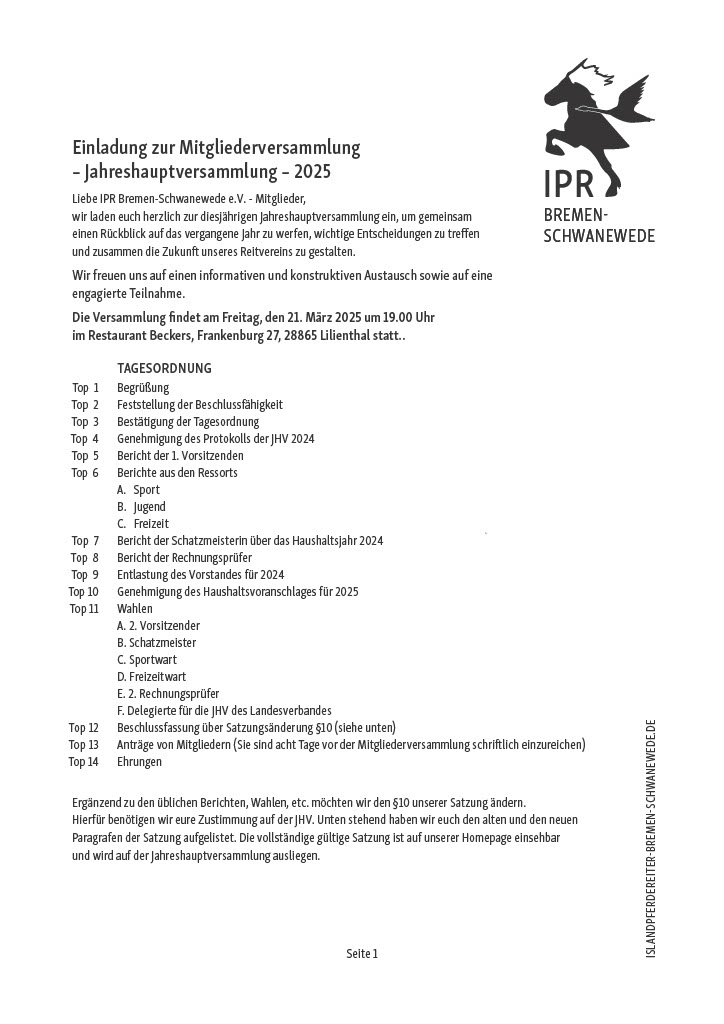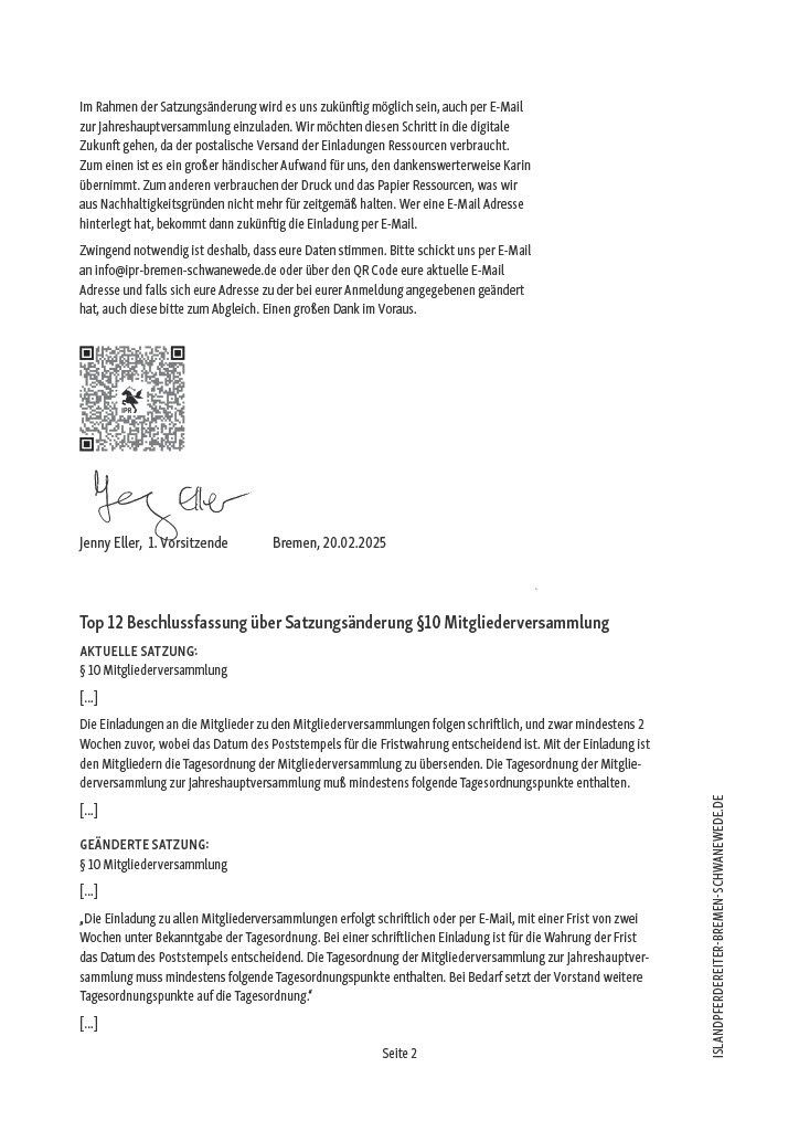 1. Einladung zur Jahreshauptversammlung am 21.03.2025Alle Mitglieder sind herzlich eingeladen, an der diesjährigen JHV teilzunehmen. Neben den üblichen Berichten und Wahlen wird ein wichtiger Punkt die geplante Satzungsänderung sein, die eine Einladung zur JHV per E-Mail ermöglichen soll.