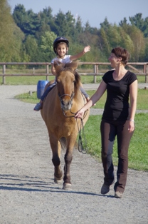 Jedes Kind wurde von einem/r Einsteller/in "betreut", durfte "sein" Pferd putzen, führen und natürlich reitend auf der Ovalbahn seine Runden drehen!