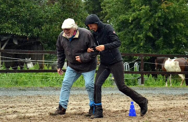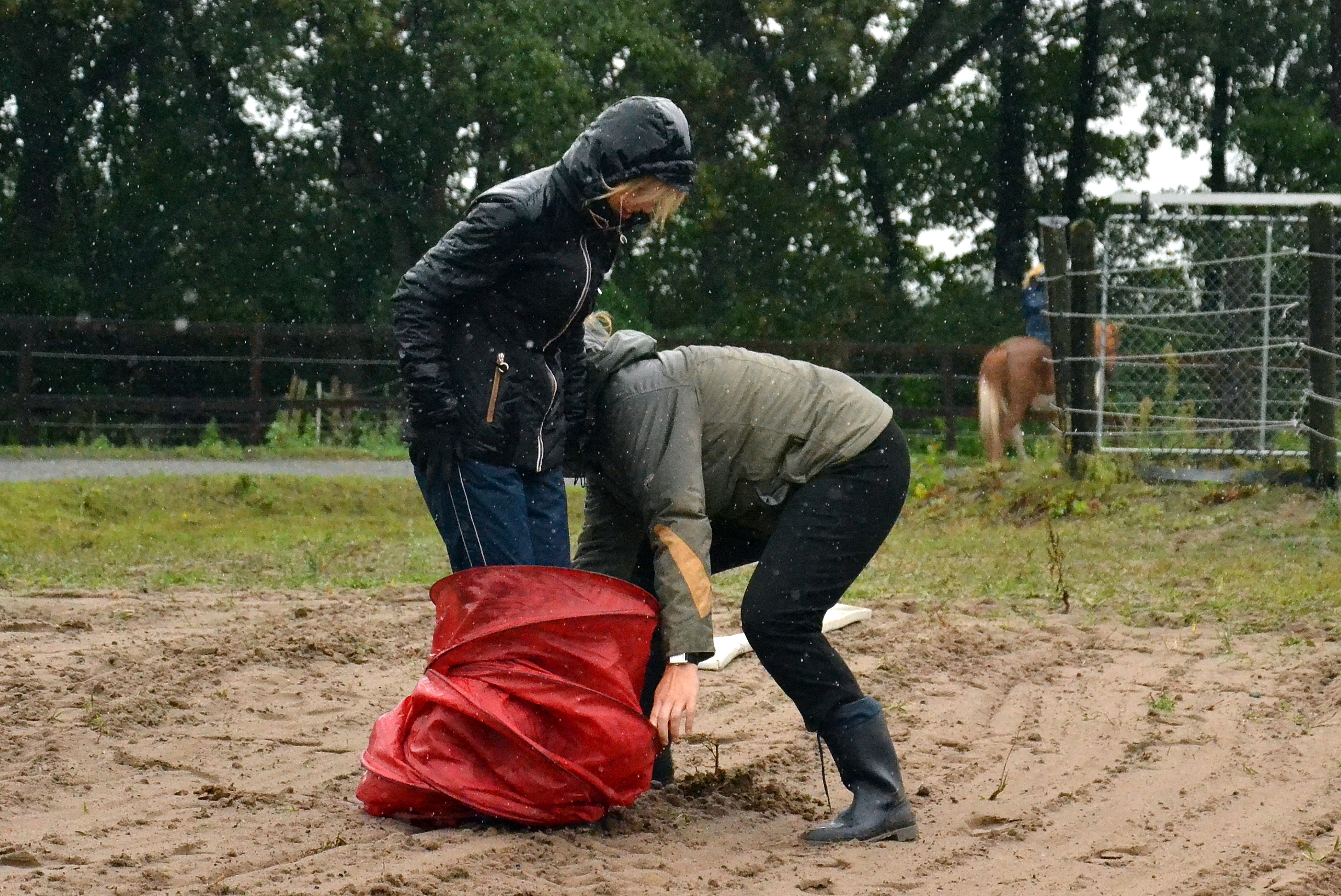 Die letzte Prüfung, der Blinde Führer, fand dann im Trockenen in der Reithalle statt. Hierbei bildeten immer die Jugendlichen mit ihrem Paten aus dem Erwachsenenteam ein Team und lotsten ihren blinden Partner geschickt durch den Parcours.