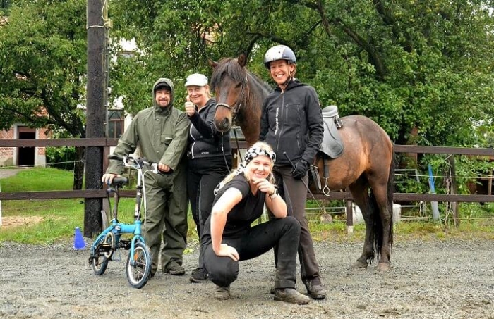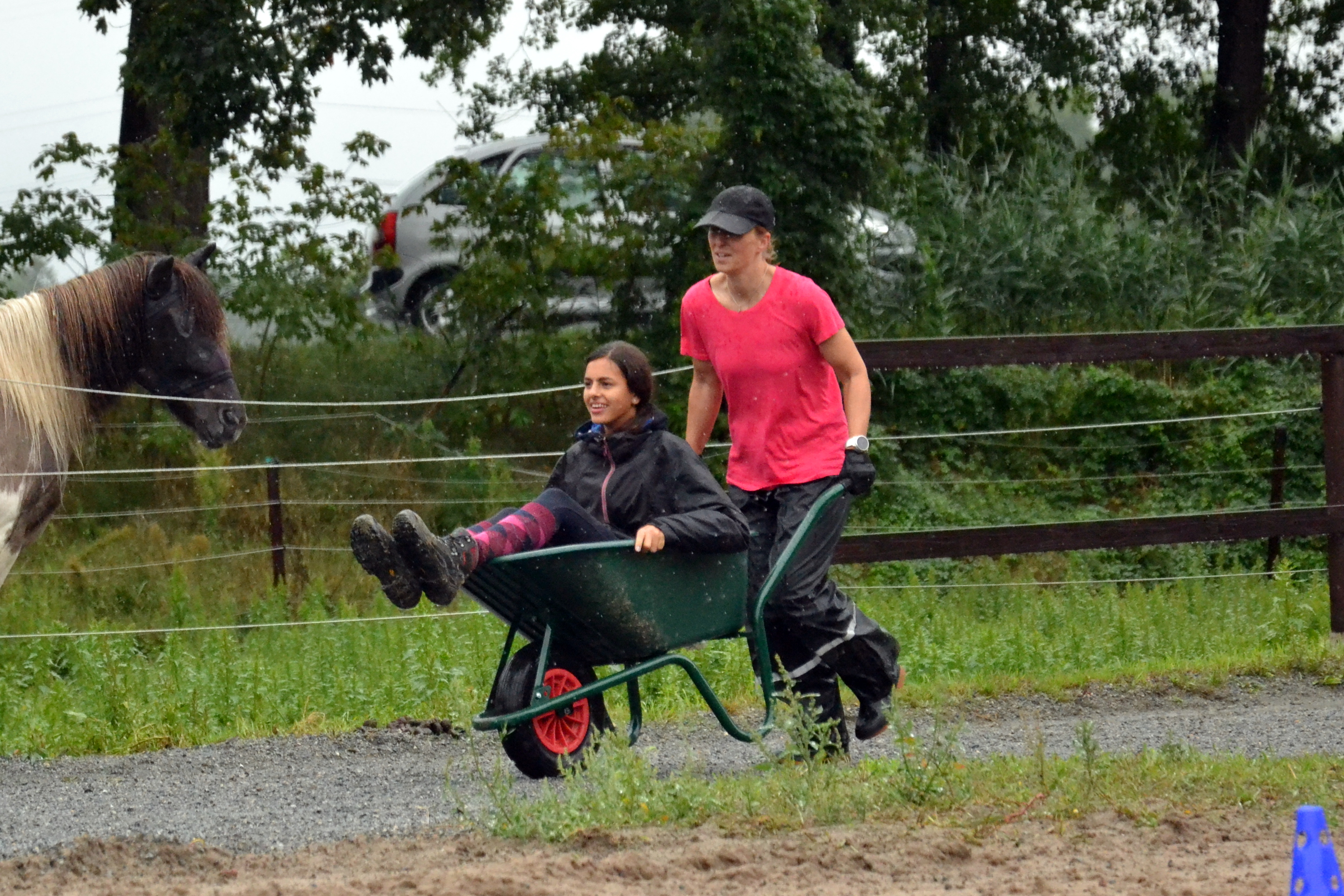 Es folgte der Triathlon. Möglichst schnell hieß es mit dem Pferd, dem Klapprad und der Schubkarre um die Bahn zu reiten, laufen und zu fahren.